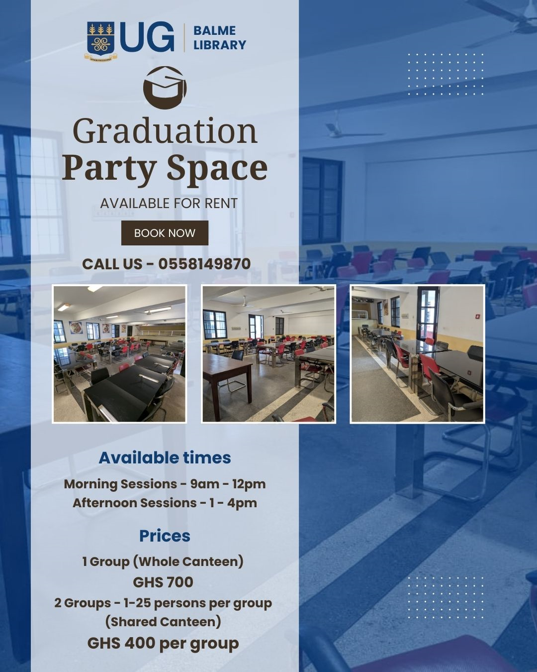 This facility is open for bookings from University of Ghana (UG) faculty, staff, student-led organizations and the general public. Persons willing to rent the space must acknowledge the rules governing the space and then submit the room booking request form below.