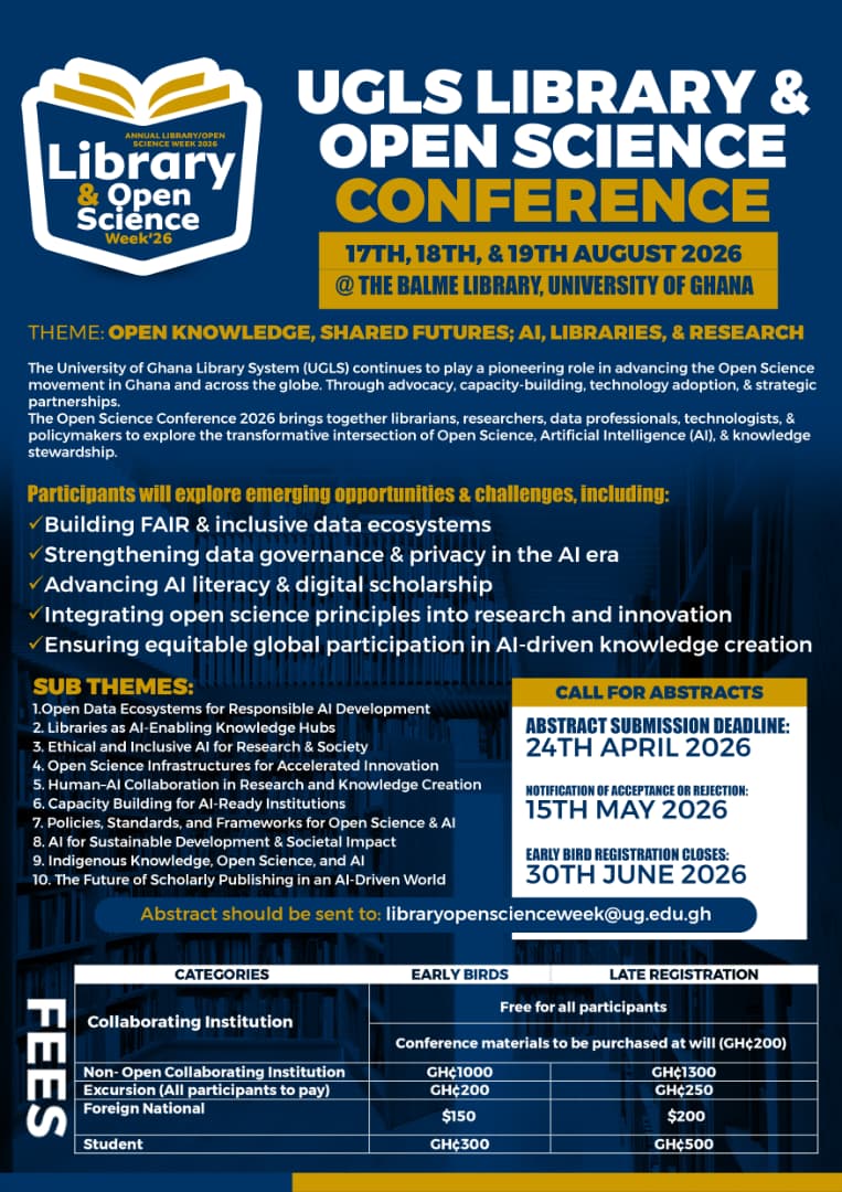 UGLS Open Science Conference Super User Home 12 April 2026 Hits: 15 Rating: ( 0 Rating ) Please Rate Vote 1 Vote 2 Vote 3 Vote 4 Vote 5 Facebook Twitter Next